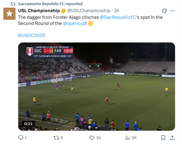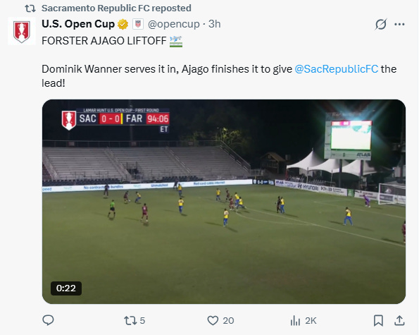 Behind an extra time brace from Sacramento Republic FC forward Forster Ajago, the Quails defeated 1993 Open Cup champion El Farolito 2-0 Wednesday night in Round 1 of the 2026 Lamar Hunt U.S. Open Cup. With the win, Republic FC move their home record to 21-3-1 all-time at home and punch their ticket to Round 2.